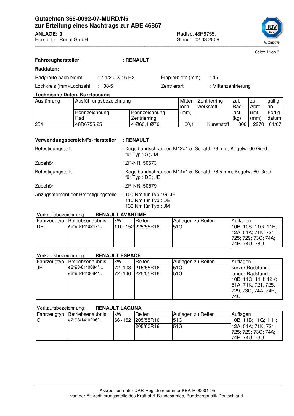 Dieses Gutachten (abe) bezieht sich auf die Alufelge Ronal 48R6755 in der Ausführung 2Jx16 ET 0, Mittenloch 0 mm (KBA 46867). Im PDF findest du typischerweise zulässige Reifengrößen, Auflagen/Anbauhinweise und – je nach Dokument – Hinweise zur Eintragung.