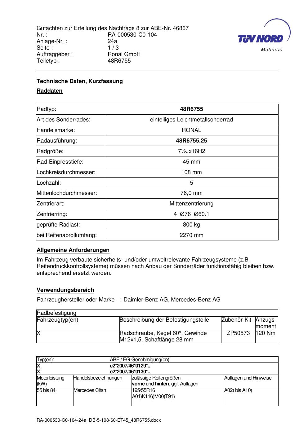 Dieses Gutachten (abe) bezieht sich auf die Alufelge brand-ronal 48R6755 in der Ausführung ET 0, Mittenloch 0 mm (KBA 46867). Im PDF findest du typischerweise zulässige Reifengrößen, Auflagen/Anbauhinweise und – je nach Dokument – Hinweise zur Eintragung.