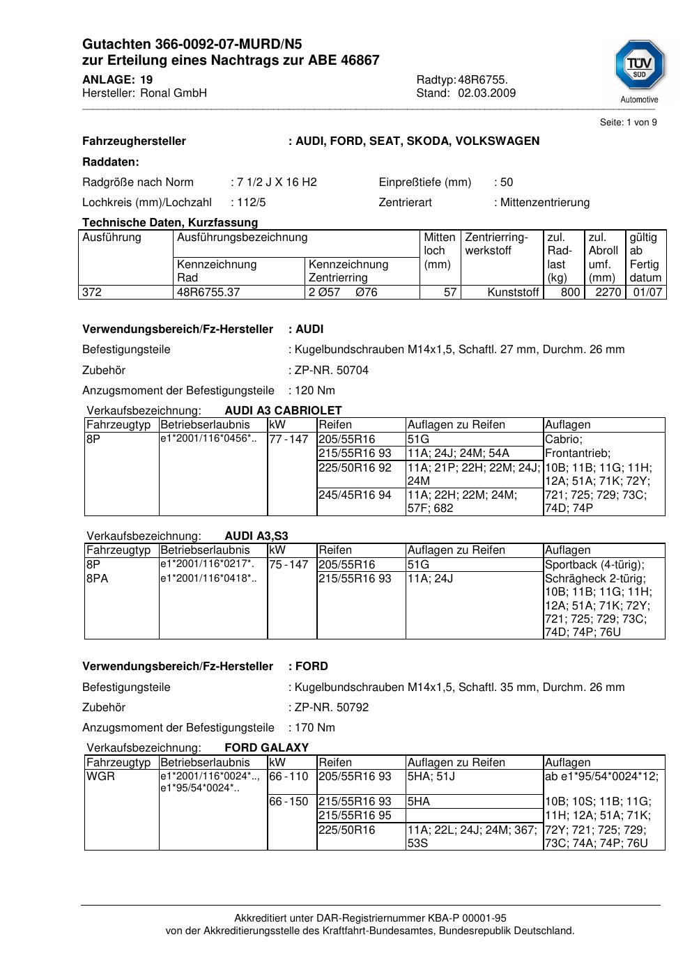 Dieses Gutachten (abe) bezieht sich auf die Alufelge Ronal 48R6755 in der Ausführung 2Jx16 ET 0, Mittenloch 0 mm (KBA 46867). Im PDF findest du typischerweise zulässige Reifengrößen, Auflagen/Anbauhinweise und – je nach Dokument – Hinweise zur Eintragung.