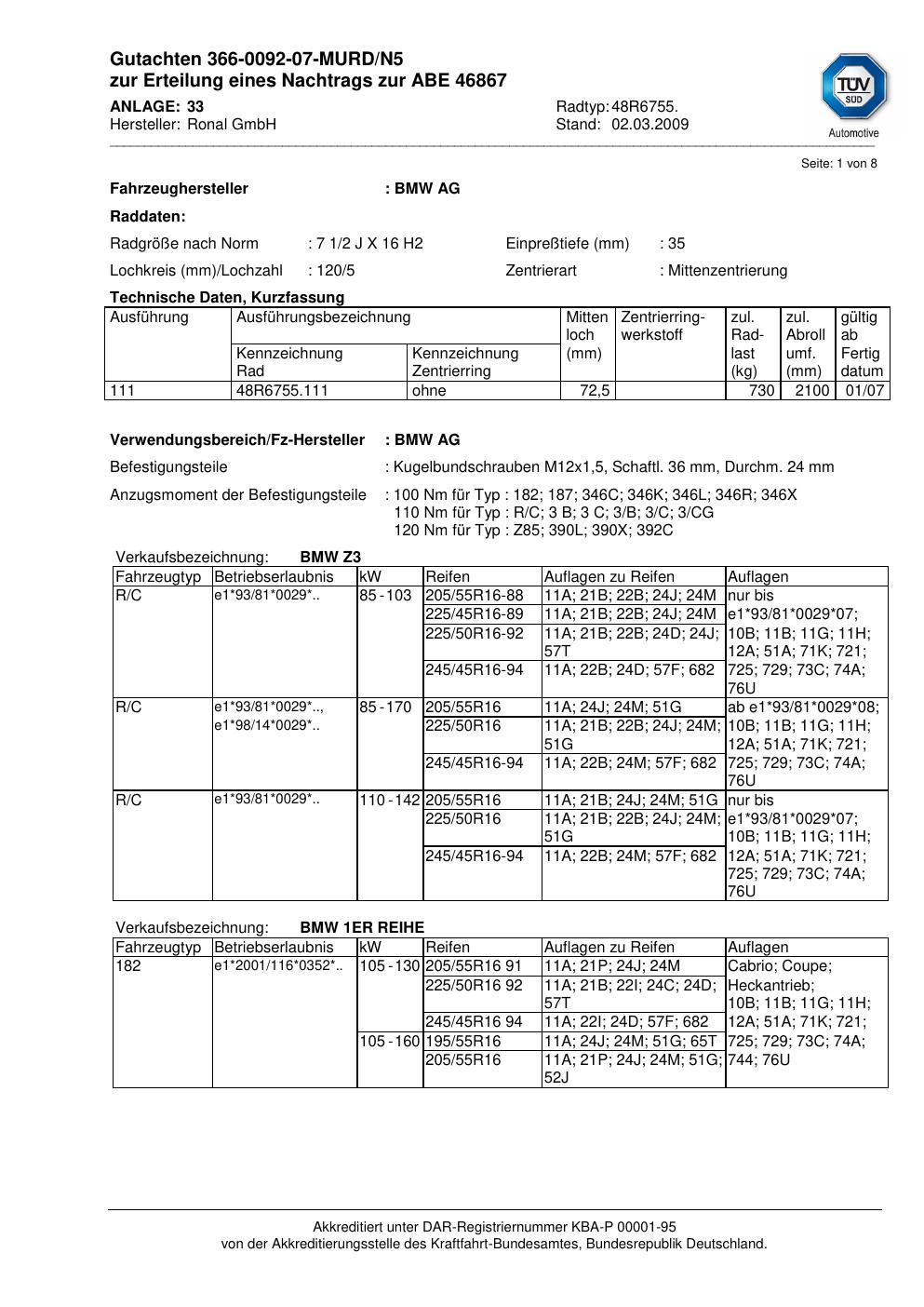 Dieses Gutachten (abe) bezieht sich auf die Alufelge Ronal 48R6755 in der Ausführung 2Jx16 ET 0, Mittenloch 0 mm (KBA 46867). Im PDF findest du typischerweise zulässige Reifengrößen, Auflagen/Anbauhinweise und – je nach Dokument – Hinweise zur Eintragung.