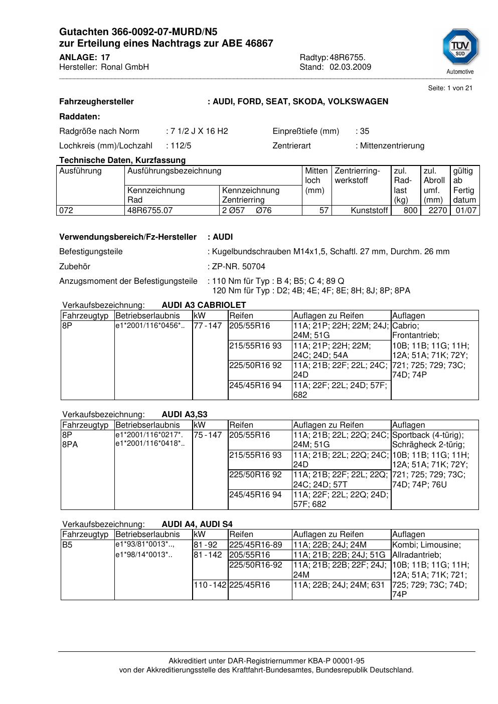 Dieses Gutachten (abe) bezieht sich auf die Alufelge Ronal 48R6755 in der Ausführung 2Jx16 ET 0, Mittenloch 0 mm (KBA 46867). Im PDF findest du typischerweise zulässige Reifengrößen, Auflagen/Anbauhinweise und – je nach Dokument – Hinweise zur Eintragung.