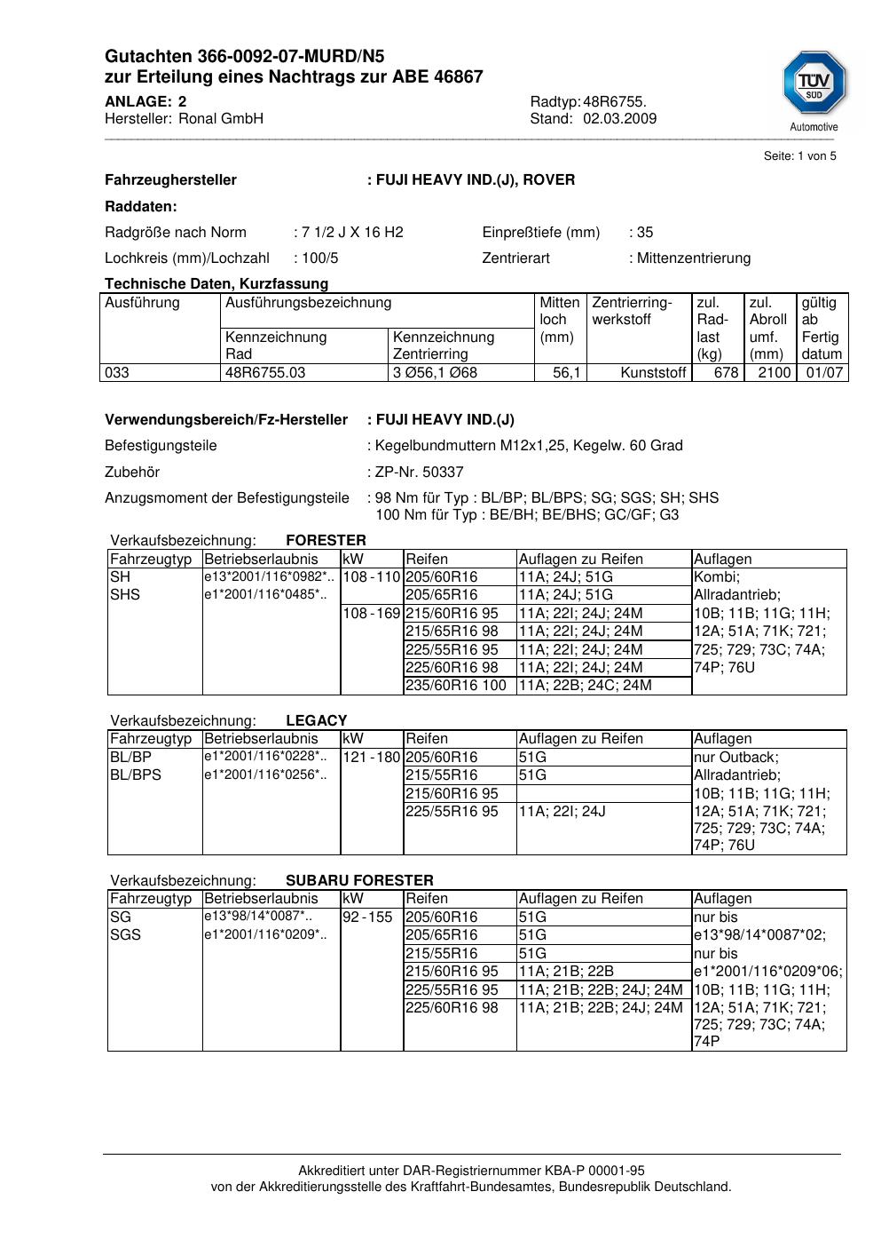 Dieses Gutachten (abe) bezieht sich auf die Alufelge Ronal 48R6755 in der Ausführung 2Jx16 ET 0, Mittenloch 0 mm (KBA 46867). Im PDF findest du typischerweise zulässige Reifengrößen, Auflagen/Anbauhinweise und – je nach Dokument – Hinweise zur Eintragung.