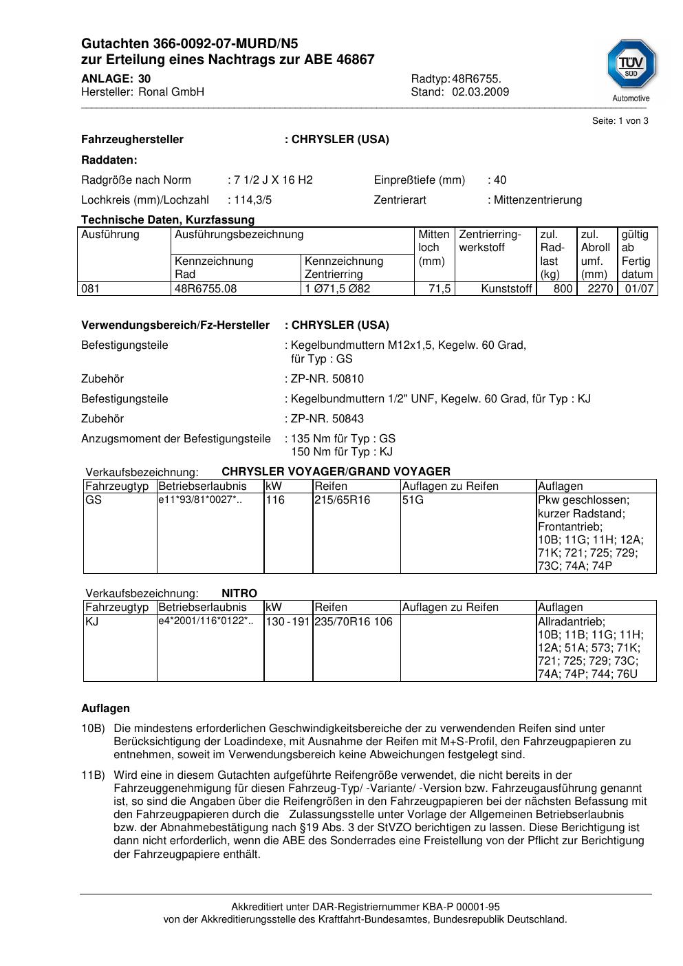Dieses Gutachten (abe) bezieht sich auf die Alufelge Ronal 48R6755 in der Ausführung 2Jx16 ET 0, Mittenloch 0 mm (KBA 46867). Im PDF findest du typischerweise zulässige Reifengrößen, Auflagen/Anbauhinweise und – je nach Dokument – Hinweise zur Eintragung.