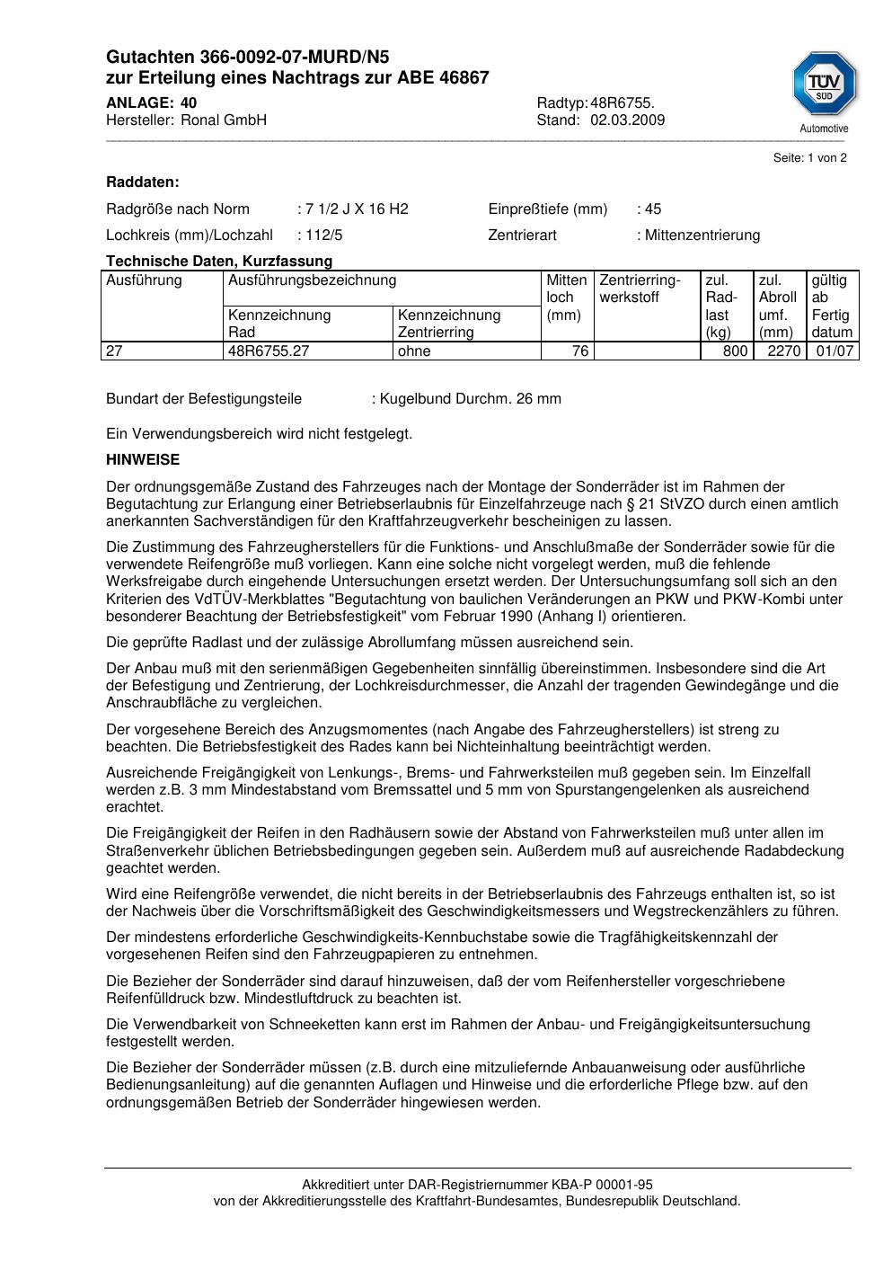 Dieses Gutachten (abe) bezieht sich auf die Alufelge Ronal 48R6755 in der Ausführung 2Jx16 ET 0, Mittenloch 0 mm (KBA 46867). Im PDF findest du typischerweise zulässige Reifengrößen, Auflagen/Anbauhinweise und – je nach Dokument – Hinweise zur Eintragung.