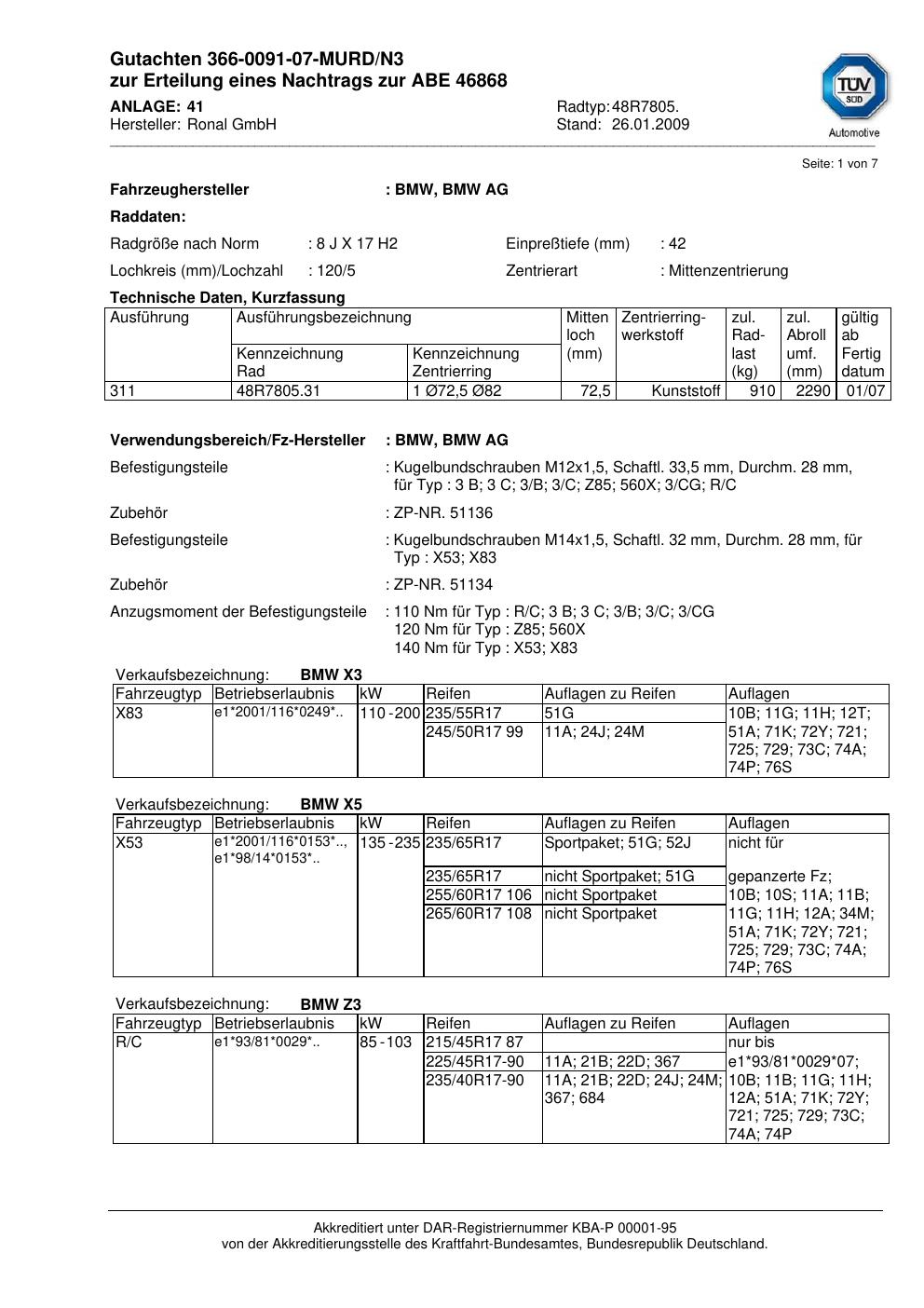 Dieses Gutachten (abe) bezieht sich auf die Alufelge Ronal 48R7805 in der Ausführung 8Jx17 ET 0, Mittenloch 0 mm (KBA 46868). Im PDF findest du typischerweise zulässige Reifengrößen, Auflagen/Anbauhinweise und – je nach Dokument – Hinweise zur Eintragung.
