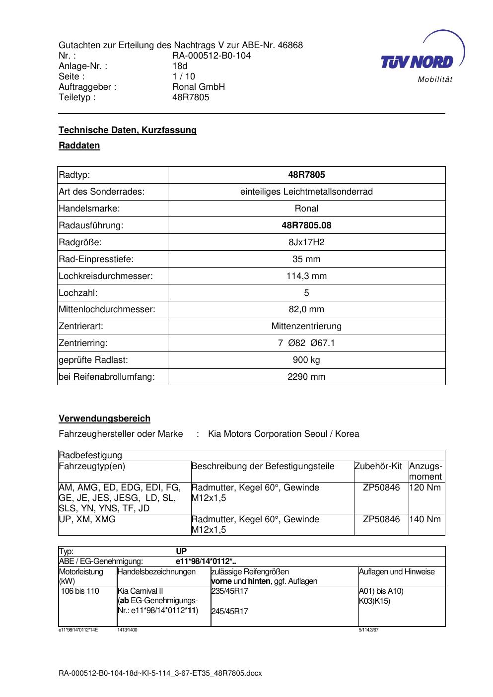 Dieses Gutachten (abe) bezieht sich auf die Alufelge brand-ronal 48R7805 in der Ausführung 8Jx17 ET 0, Mittenloch 0 mm (KBA 46868). Im PDF findest du typischerweise zulässige Reifengrößen, Auflagen/Anbauhinweise und – je nach Dokument – Hinweise zur Eintragung.