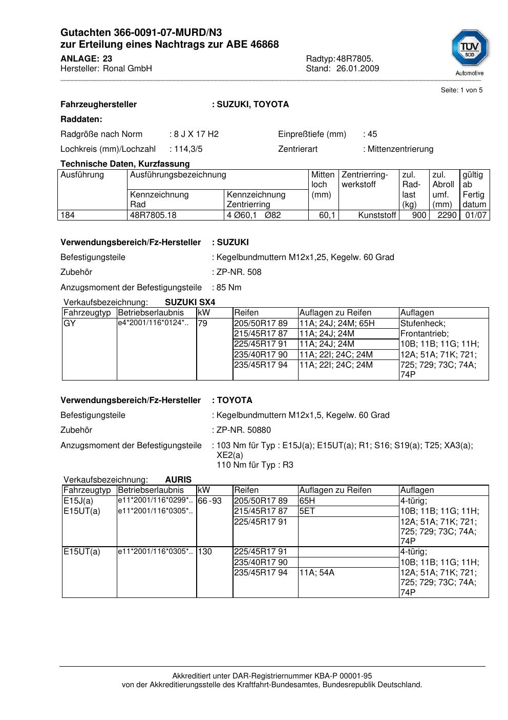 Dieses Gutachten (abe) bezieht sich auf die Alufelge Ronal 48R7805 in der Ausführung 8Jx17 ET 0, Mittenloch 0 mm (KBA 46868). Im PDF findest du typischerweise zulässige Reifengrößen, Auflagen/Anbauhinweise und – je nach Dokument – Hinweise zur Eintragung.