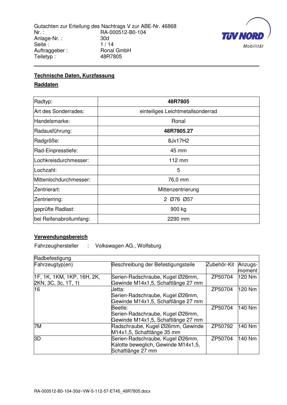 Dieses Gutachten (abe) bezieht sich auf die Alufelge brand-ronal 48R7805 in der Ausführung 8Jx17 ET 0, Mittenloch 0 mm (KBA 46868). Im PDF findest du typischerweise zulässige Reifengrößen, Auflagen/Anbauhinweise und – je nach Dokument – Hinweise zur Eintragung.