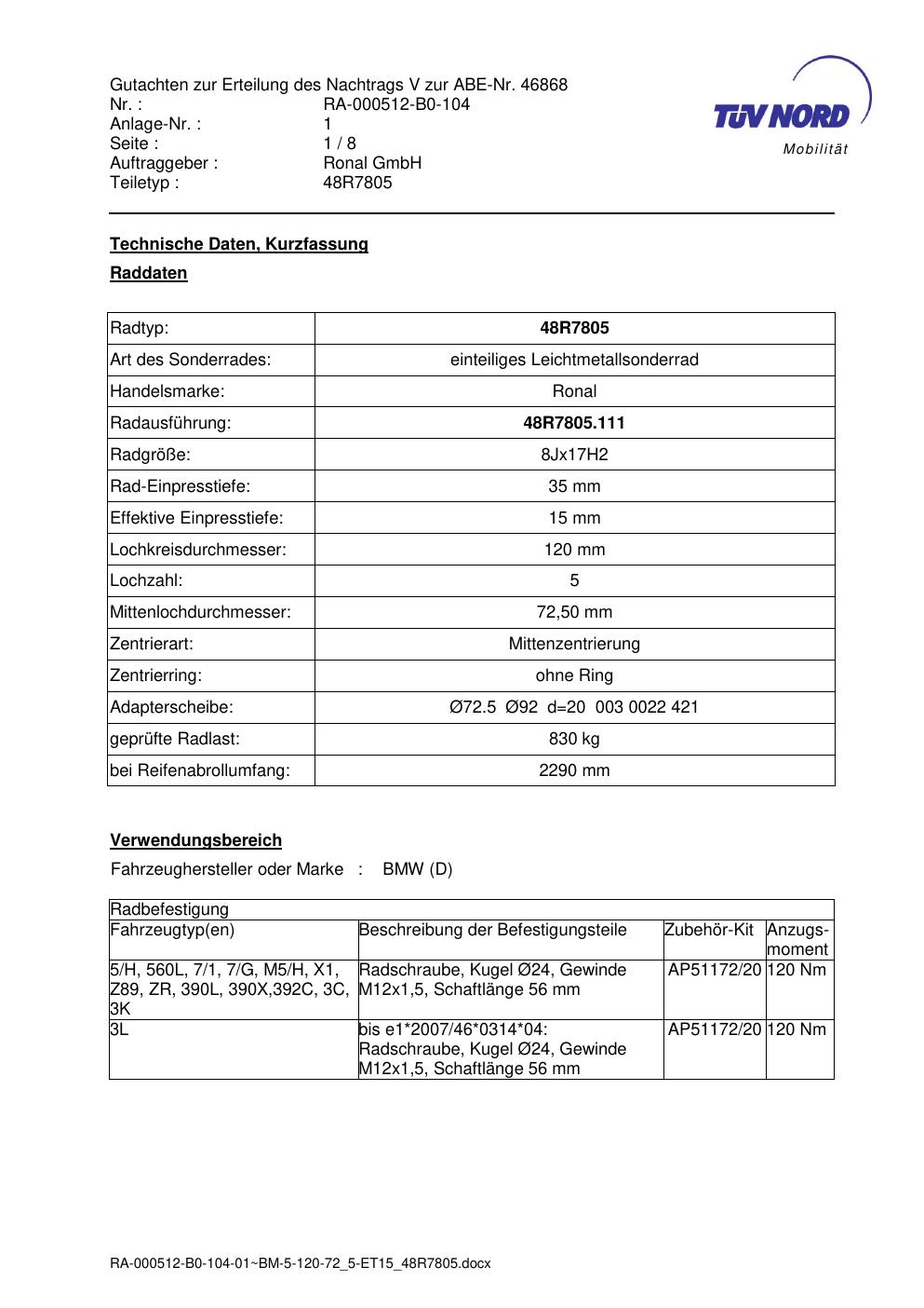 Dieses Gutachten (abe) bezieht sich auf die Alufelge brand-ronal 48R7805 in der Ausführung 8Jx17 ET 0, Mittenloch 0 mm (KBA 46868). Im PDF findest du typischerweise zulässige Reifengrößen, Auflagen/Anbauhinweise und – je nach Dokument – Hinweise zur Eintragung.