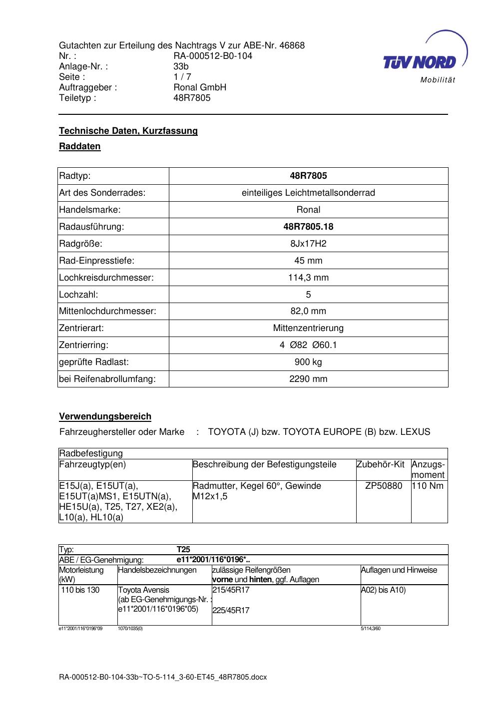 Dieses Gutachten (abe) bezieht sich auf die Alufelge brand-ronal 48R7805 in der Ausführung 8Jx17 ET 0, Mittenloch 0 mm (KBA 46868). Im PDF findest du typischerweise zulässige Reifengrößen, Auflagen/Anbauhinweise und – je nach Dokument – Hinweise zur Eintragung.