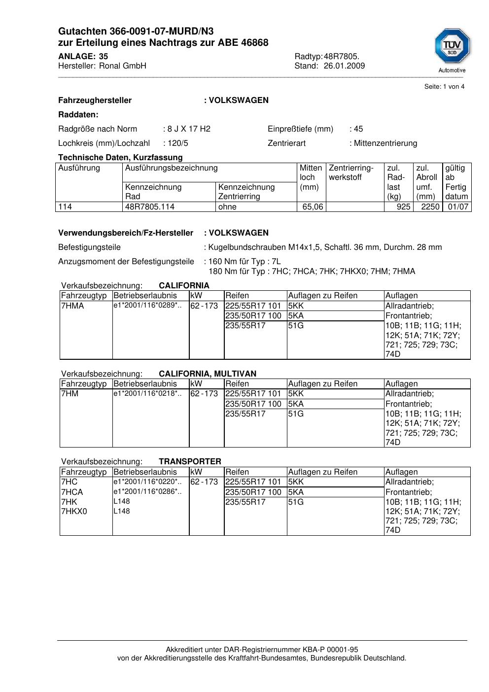 Dieses Gutachten (abe) bezieht sich auf die Alufelge Ronal 48R7805 in der Ausführung 8Jx17 ET 0, Mittenloch 0 mm (KBA 46868). Im PDF findest du typischerweise zulässige Reifengrößen, Auflagen/Anbauhinweise und – je nach Dokument – Hinweise zur Eintragung.