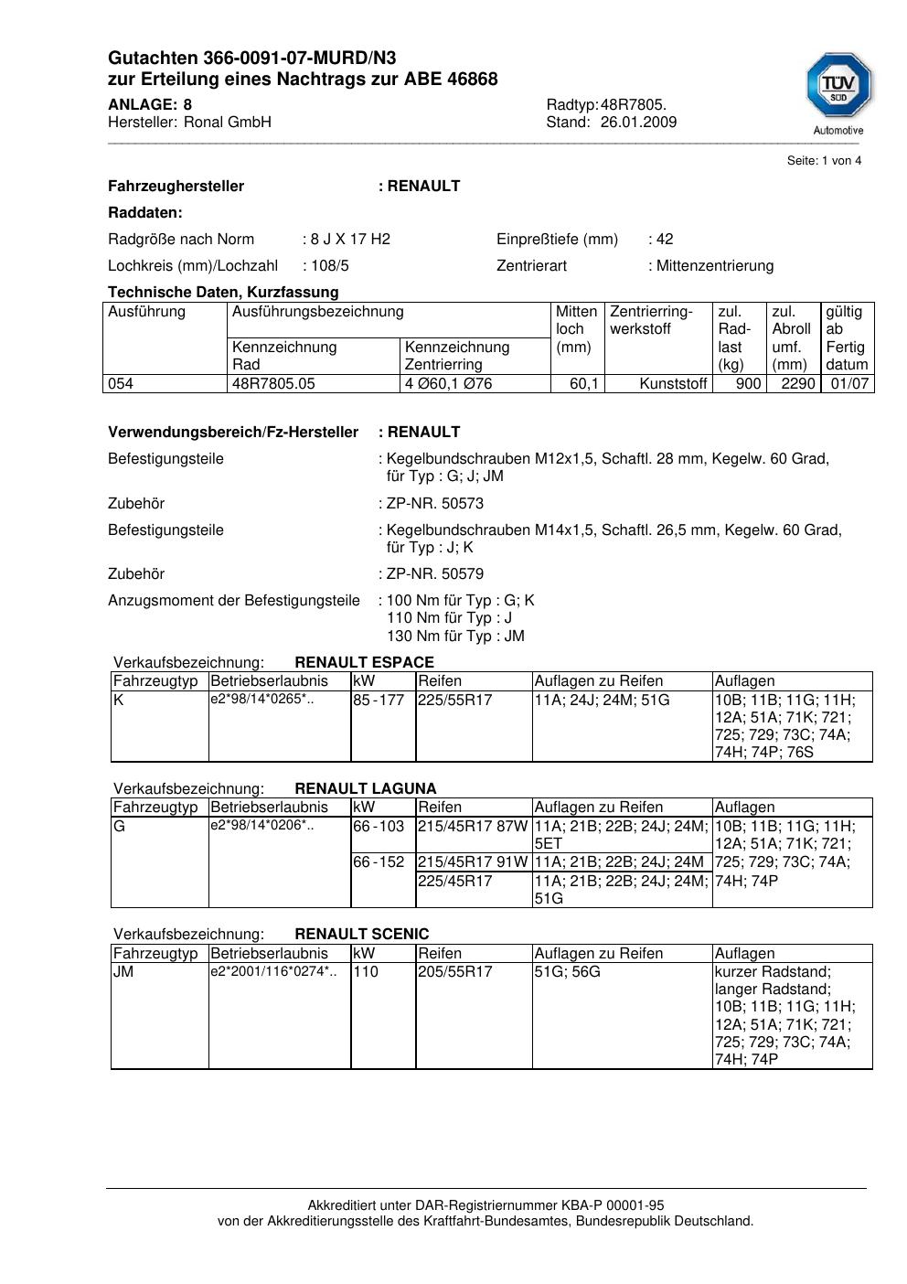 Dieses Gutachten (abe) bezieht sich auf die Alufelge Ronal 48R7805 in der Ausführung 8Jx17 ET 0, Mittenloch 0 mm (KBA 46868). Im PDF findest du typischerweise zulässige Reifengrößen, Auflagen/Anbauhinweise und – je nach Dokument – Hinweise zur Eintragung.