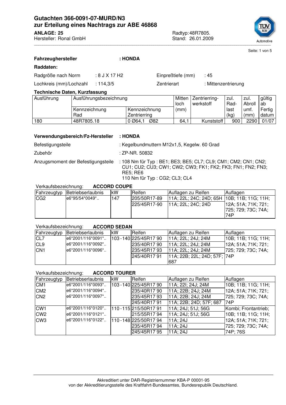 Dieses Gutachten (abe) bezieht sich auf die Alufelge Ronal 48R7805 in der Ausführung 8Jx17 ET 0, Mittenloch 0 mm (KBA 46868). Im PDF findest du typischerweise zulässige Reifengrößen, Auflagen/Anbauhinweise und – je nach Dokument – Hinweise zur Eintragung.