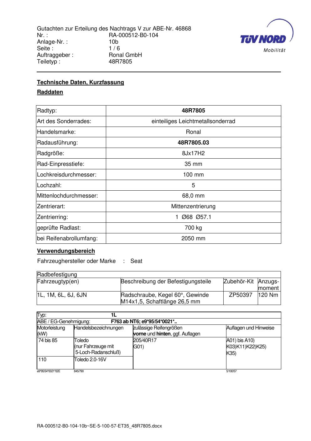 Dieses Gutachten (abe) bezieht sich auf die Alufelge brand-ronal 48R7805 in der Ausführung 8Jx17 ET 0, Mittenloch 0 mm (KBA 46868). Im PDF findest du typischerweise zulässige Reifengrößen, Auflagen/Anbauhinweise und – je nach Dokument – Hinweise zur Eintragung.