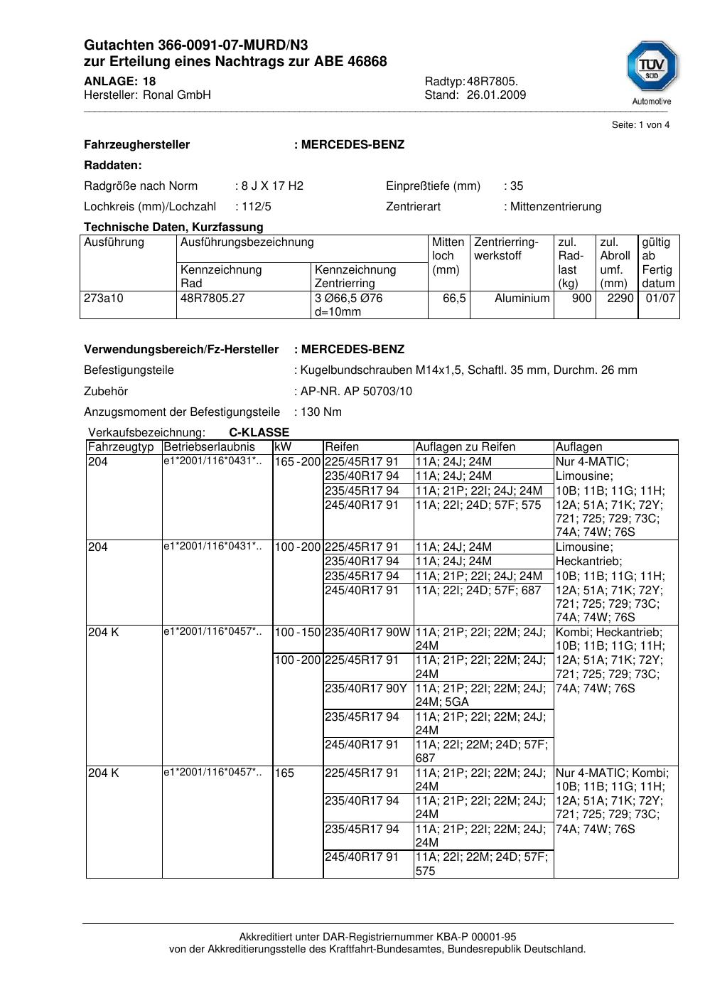 Dieses Gutachten (abe) bezieht sich auf die Alufelge brand-ronal 48R7805 in der Ausführung 8Jx17 ET 0, Mittenloch 0 mm (KBA 46868). Im PDF findest du typischerweise zulässige Reifengrößen, Auflagen/Anbauhinweise und – je nach Dokument – Hinweise zur Eintragung.