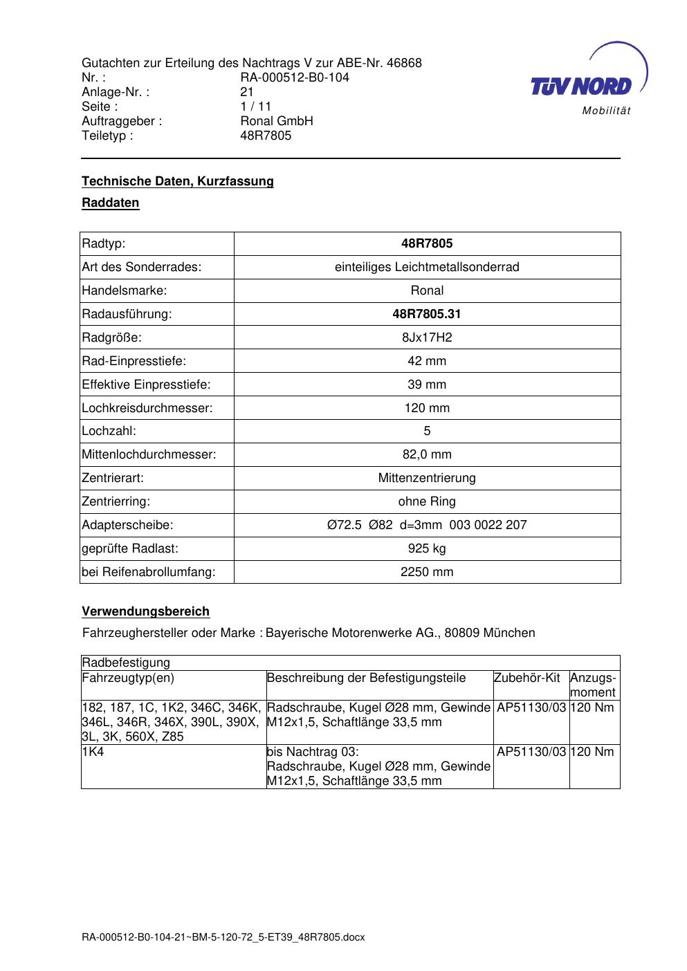 Dieses Gutachten (abe) bezieht sich auf die Alufelge brand-ronal 48R7805 in der Ausführung 8Jx17 ET 0, Mittenloch 0 mm (KBA 46868). Im PDF findest du typischerweise zulässige Reifengrößen, Auflagen/Anbauhinweise und – je nach Dokument – Hinweise zur Eintragung.