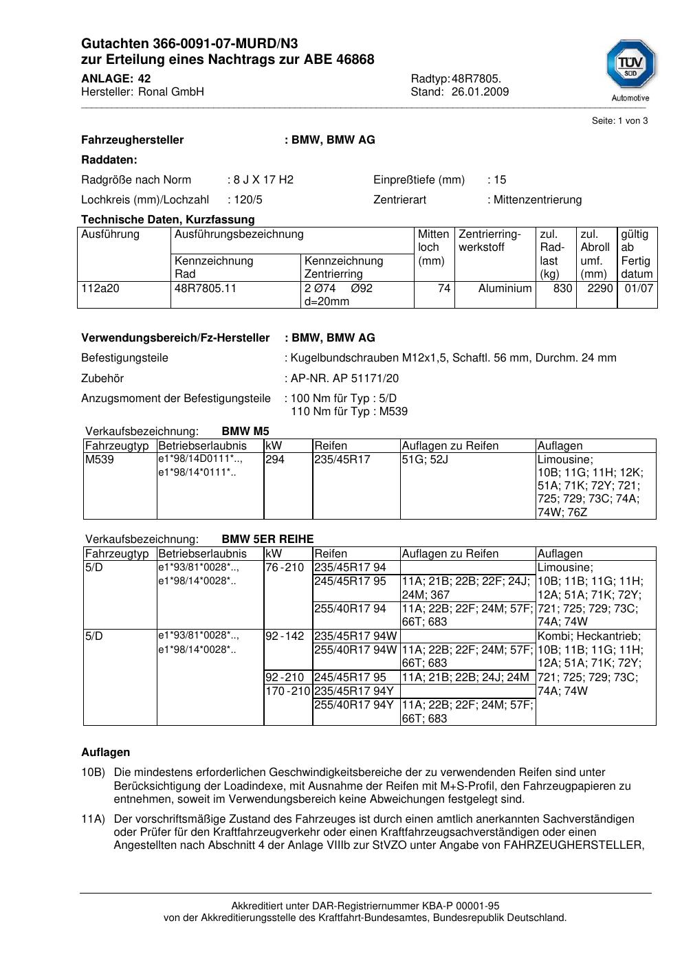 Dieses Gutachten (abe) bezieht sich auf die Alufelge brand-ronal 48R7805 in der Ausführung 8Jx17 ET 0, Mittenloch 0 mm (KBA 46868). Im PDF findest du typischerweise zulässige Reifengrößen, Auflagen/Anbauhinweise und – je nach Dokument – Hinweise zur Eintragung.