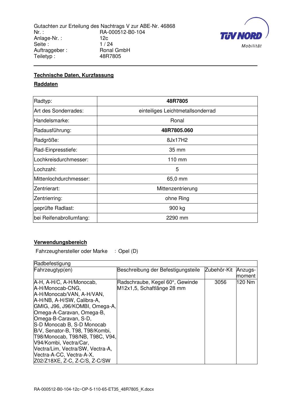 Dieses Gutachten (abe) bezieht sich auf die Alufelge brand-ronal 48R7805 in der Ausführung 8Jx17 ET 0, Mittenloch 0 mm (KBA 46868). Im PDF findest du typischerweise zulässige Reifengrößen, Auflagen/Anbauhinweise und – je nach Dokument – Hinweise zur Eintragung.