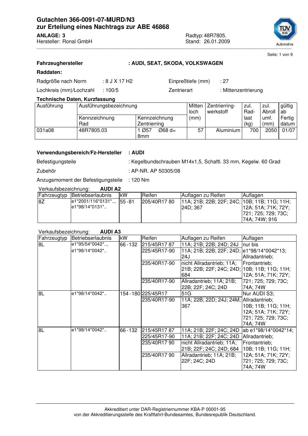 Dieses Gutachten (abe) bezieht sich auf die Alufelge brand-ronal 48R7805 in der Ausführung 8Jx17 ET 0, Mittenloch 0 mm (KBA 46868). Im PDF findest du typischerweise zulässige Reifengrößen, Auflagen/Anbauhinweise und – je nach Dokument – Hinweise zur Eintragung.