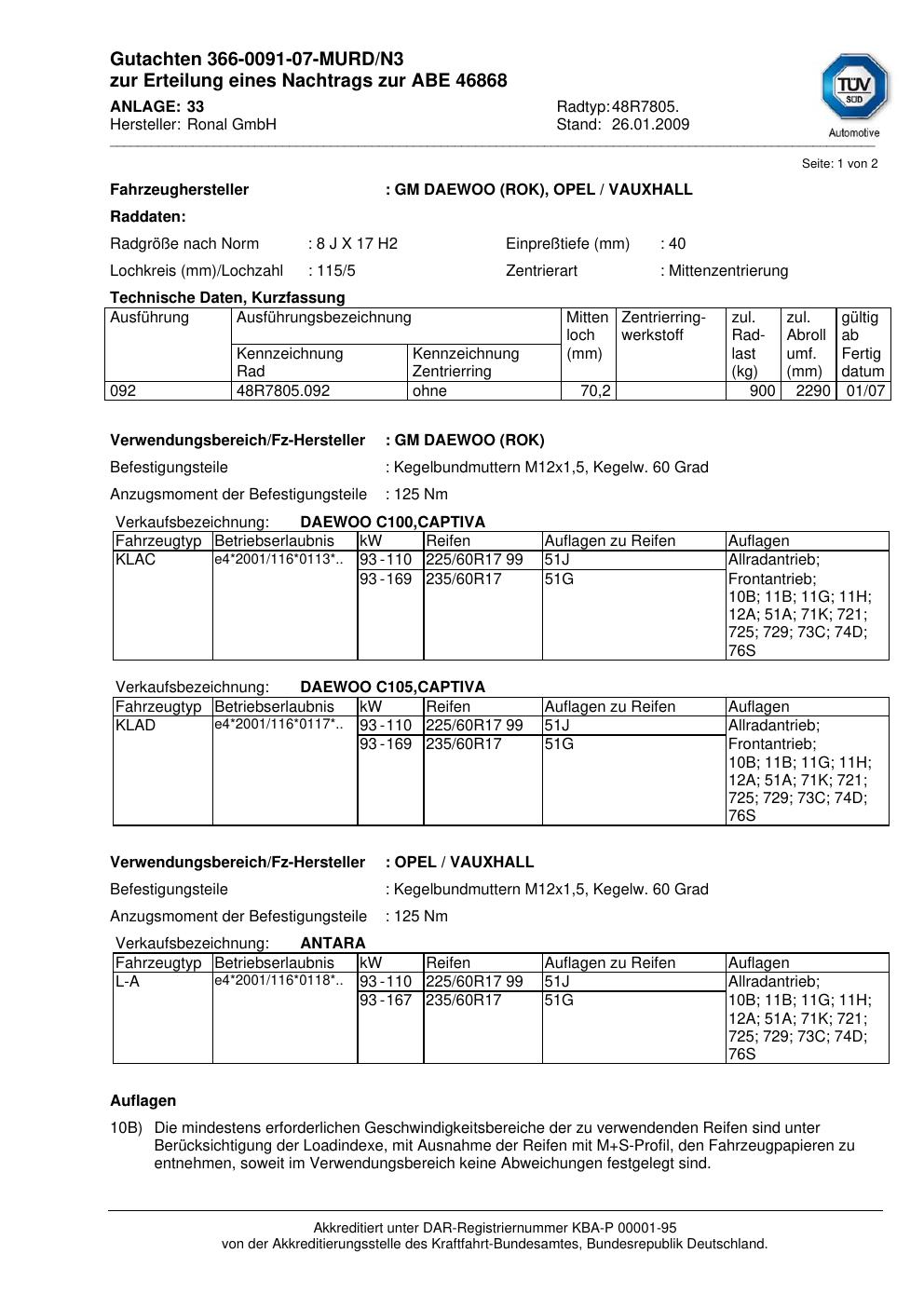 Dieses Gutachten (abe) bezieht sich auf die Alufelge Ronal 48R7805 in der Ausführung 8Jx17 ET 0, Mittenloch 0 mm (KBA 46868). Im PDF findest du typischerweise zulässige Reifengrößen, Auflagen/Anbauhinweise und – je nach Dokument – Hinweise zur Eintragung.