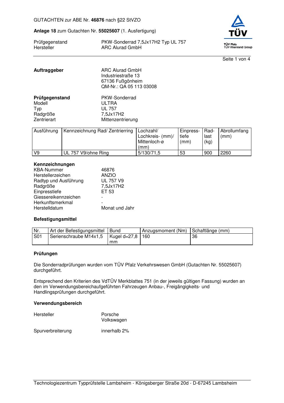 Dieses Gutachten (abe) bezieht sich auf die Alufelge Anzio UL 757 in der Ausführung 7.5Jx17 ET 0, Mittenloch 0 mm (KBA 46876). Im PDF findest du typischerweise zulässige Reifengrößen, Auflagen/Anbauhinweise und – je nach Dokument – Hinweise zur Eintragung.