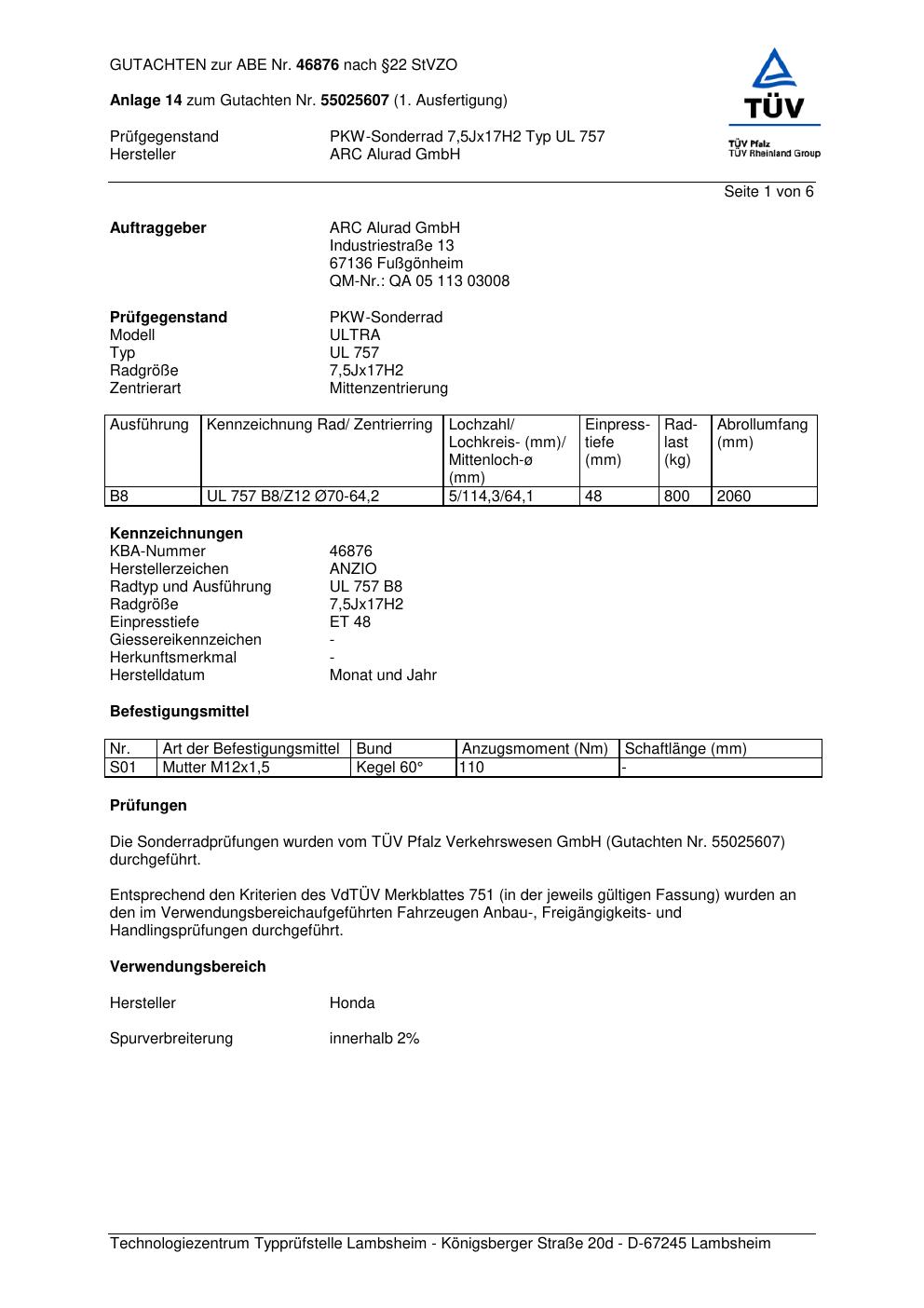 Dieses Gutachten (abe) bezieht sich auf die Alufelge Anzio UL 757 in der Ausführung 7.5Jx17 ET 0, Mittenloch 0 mm (KBA 46876). Im PDF findest du typischerweise zulässige Reifengrößen, Auflagen/Anbauhinweise und – je nach Dokument – Hinweise zur Eintragung.