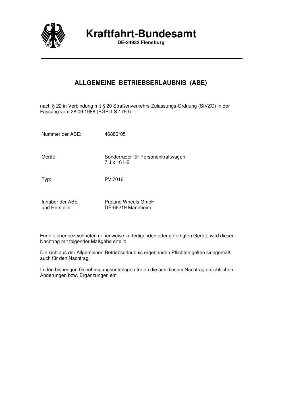 Dieses Gutachten (abe) bezieht sich auf die Alufelge ATS PV.7016 in der Ausführung 7Jx16 ET 0, Mittenloch 0 mm (KBA 46886). Im PDF findest du typischerweise zulässige Reifengrößen, Auflagen/Anbauhinweise und – je nach Dokument – Hinweise zur Eintragung.