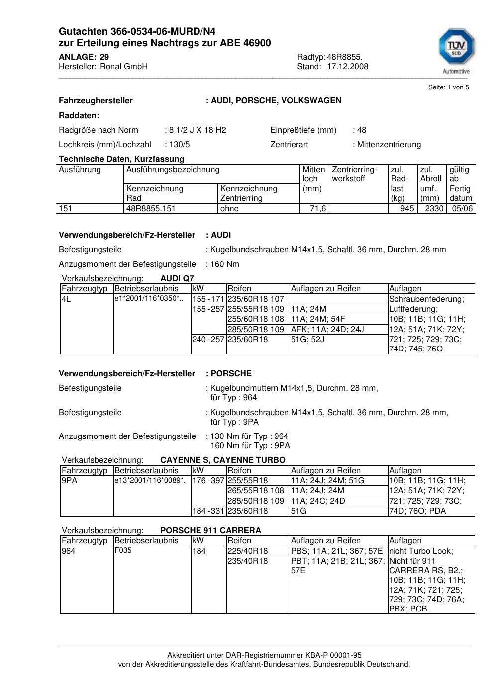 Dieses Gutachten (abe) bezieht sich auf die Alufelge Ronal 48R8855 in der Ausführung 2Jx18 ET 0, Mittenloch 0 mm (KBA 46900). Im PDF findest du typischerweise zulässige Reifengrößen, Auflagen/Anbauhinweise und – je nach Dokument – Hinweise zur Eintragung.