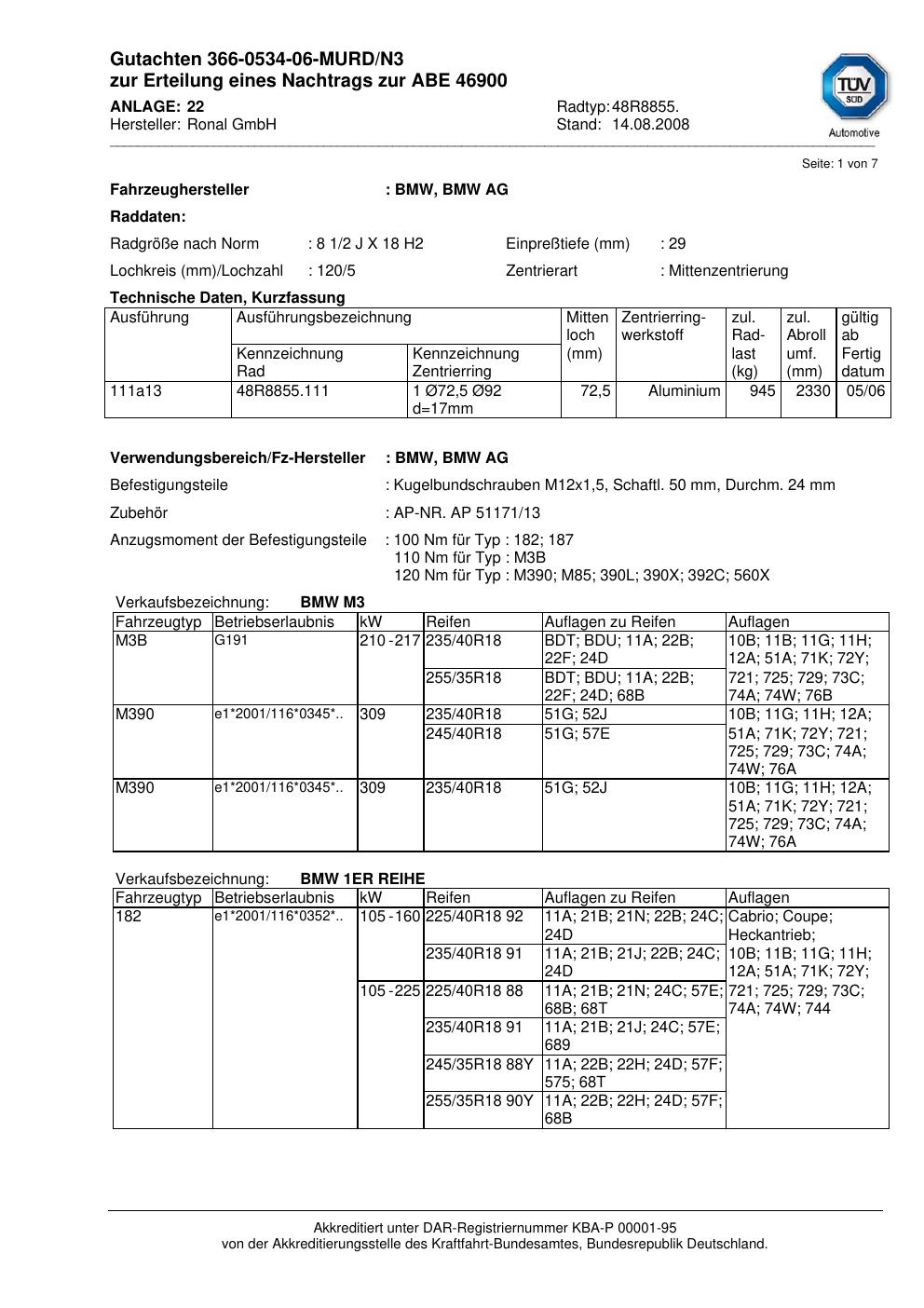 Dieses Gutachten (abe) bezieht sich auf die Alufelge Ronal 48R8855 in der Ausführung 2Jx18 ET 0, Mittenloch 0 mm (KBA 46900). Im PDF findest du typischerweise zulässige Reifengrößen, Auflagen/Anbauhinweise und – je nach Dokument – Hinweise zur Eintragung.