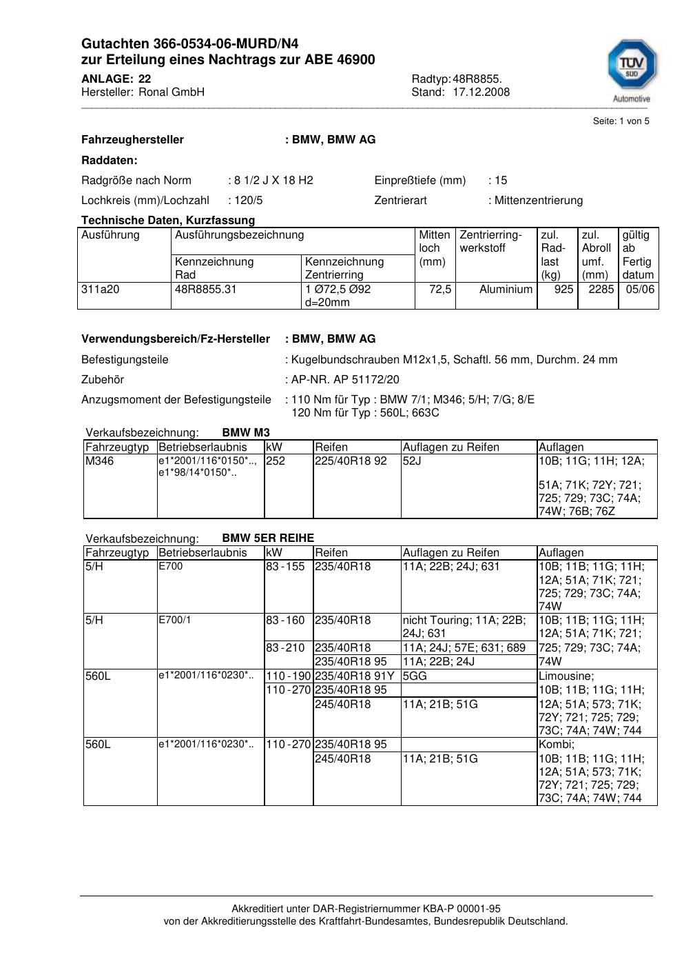 Dieses Gutachten (abe) bezieht sich auf die Alufelge Ronal 48R8855 in der Ausführung 2Jx18 ET 0, Mittenloch 0 mm (KBA 46900). Im PDF findest du typischerweise zulässige Reifengrößen, Auflagen/Anbauhinweise und – je nach Dokument – Hinweise zur Eintragung.