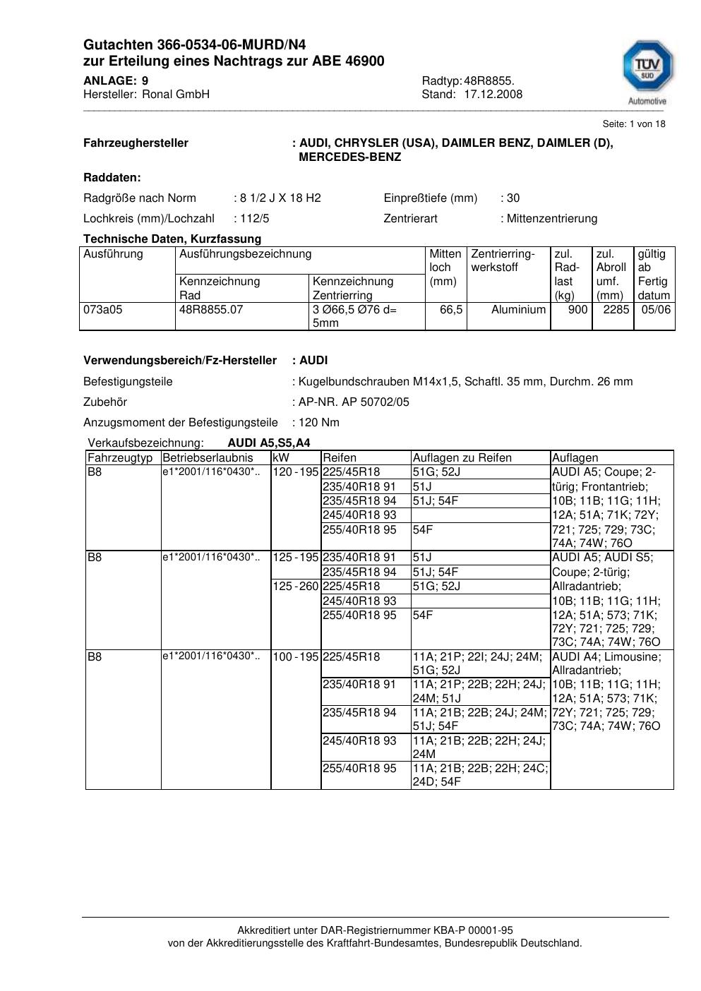 Dieses Gutachten (abe) bezieht sich auf die Alufelge Ronal 48R8855 in der Ausführung 2Jx18 ET 0, Mittenloch 0 mm (KBA 46900). Im PDF findest du typischerweise zulässige Reifengrößen, Auflagen/Anbauhinweise und – je nach Dokument – Hinweise zur Eintragung.