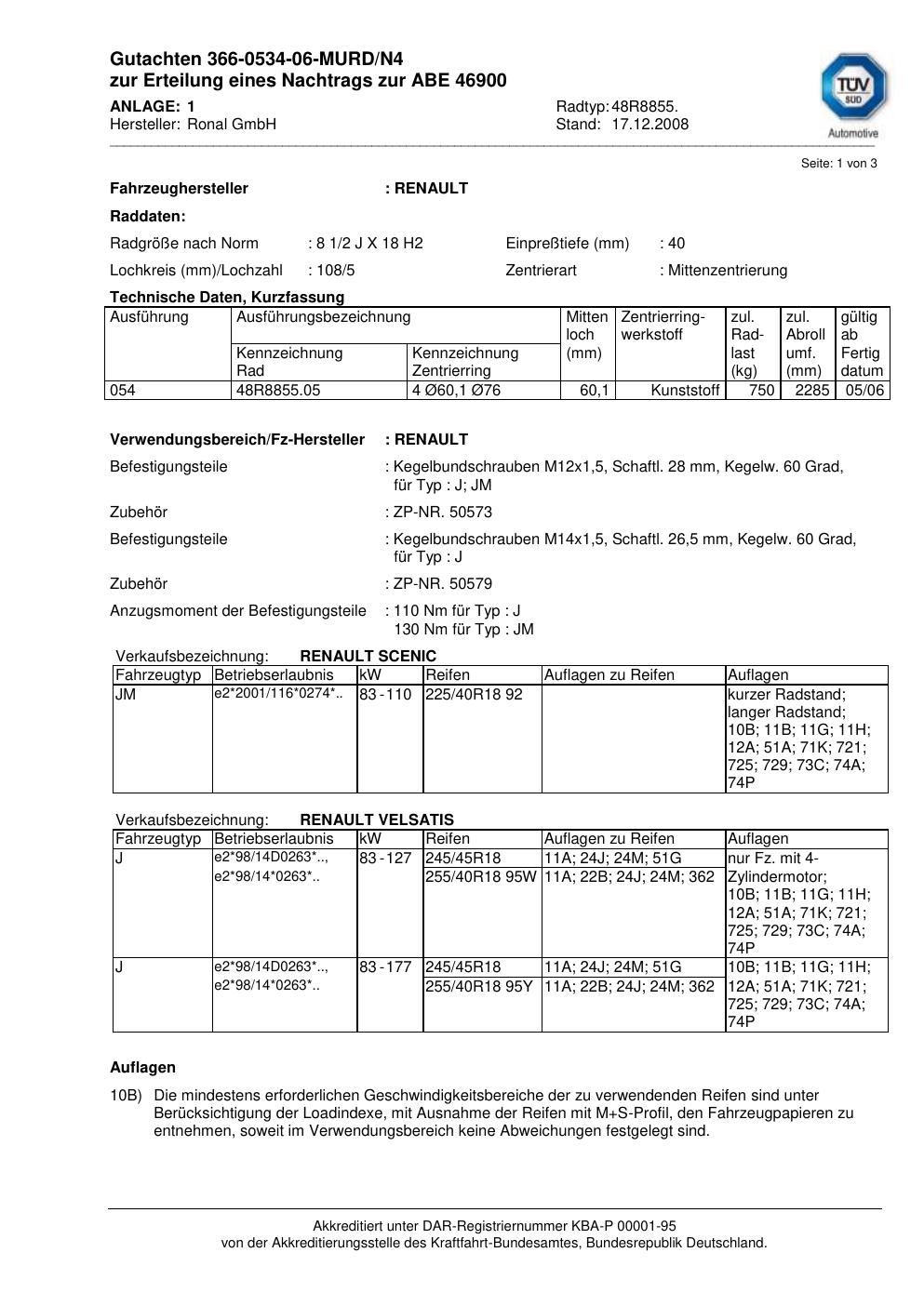 Dieses Gutachten (abe) bezieht sich auf die Alufelge Ronal 48R8855 in der Ausführung 2Jx18 ET 0, Mittenloch 0 mm (KBA 46900). Im PDF findest du typischerweise zulässige Reifengrößen, Auflagen/Anbauhinweise und – je nach Dokument – Hinweise zur Eintragung.