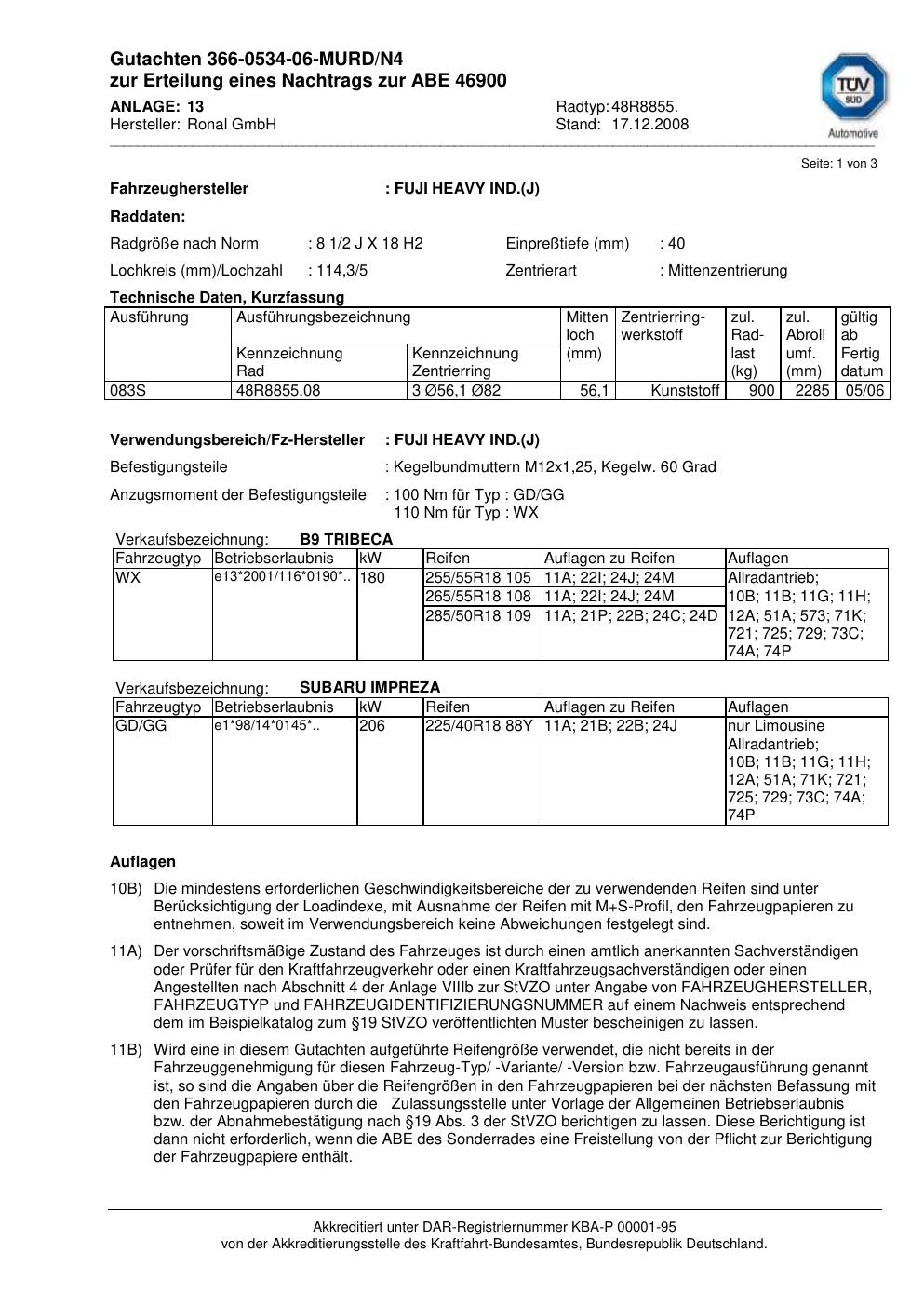 Dieses Gutachten (abe) bezieht sich auf die Alufelge Ronal 48R8855 in der Ausführung 2Jx18 ET 0, Mittenloch 0 mm (KBA 46900). Im PDF findest du typischerweise zulässige Reifengrößen, Auflagen/Anbauhinweise und – je nach Dokument – Hinweise zur Eintragung.