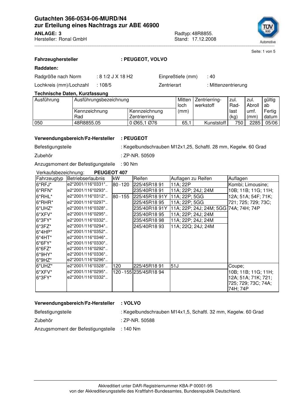 Dieses Gutachten (abe) bezieht sich auf die Alufelge Ronal 48R8855 in der Ausführung 2Jx18 ET 0, Mittenloch 0 mm (KBA 46900). Im PDF findest du typischerweise zulässige Reifengrößen, Auflagen/Anbauhinweise und – je nach Dokument – Hinweise zur Eintragung.