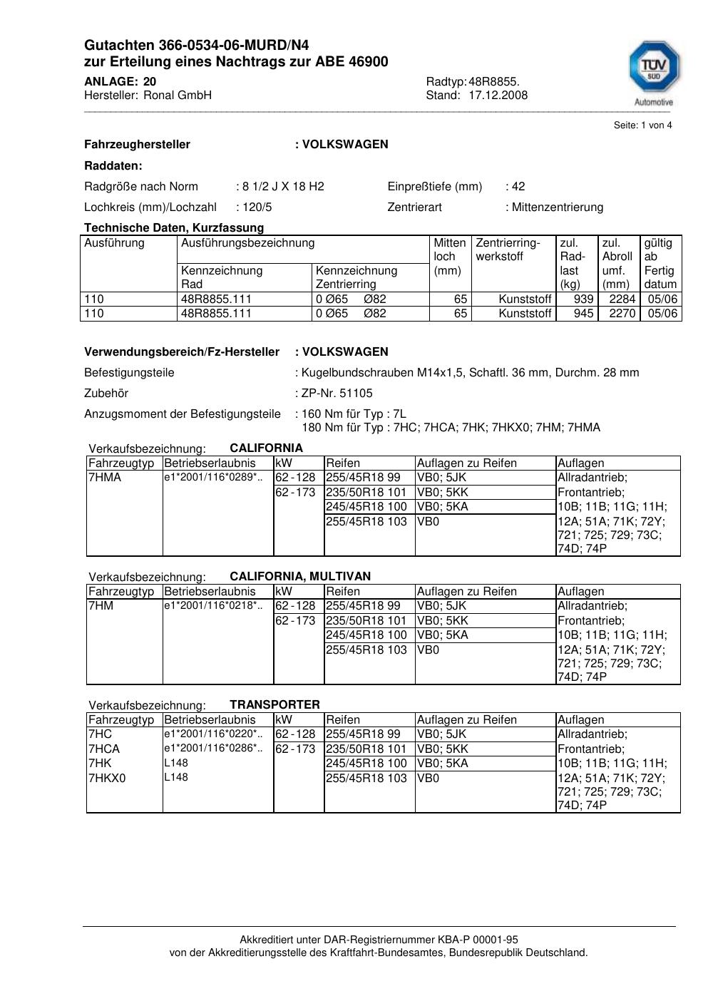 Dieses Gutachten (abe) bezieht sich auf die Alufelge Ronal 48R8855 in der Ausführung 2Jx18 ET 0, Mittenloch 0 mm (KBA 46900). Im PDF findest du typischerweise zulässige Reifengrößen, Auflagen/Anbauhinweise und – je nach Dokument – Hinweise zur Eintragung.