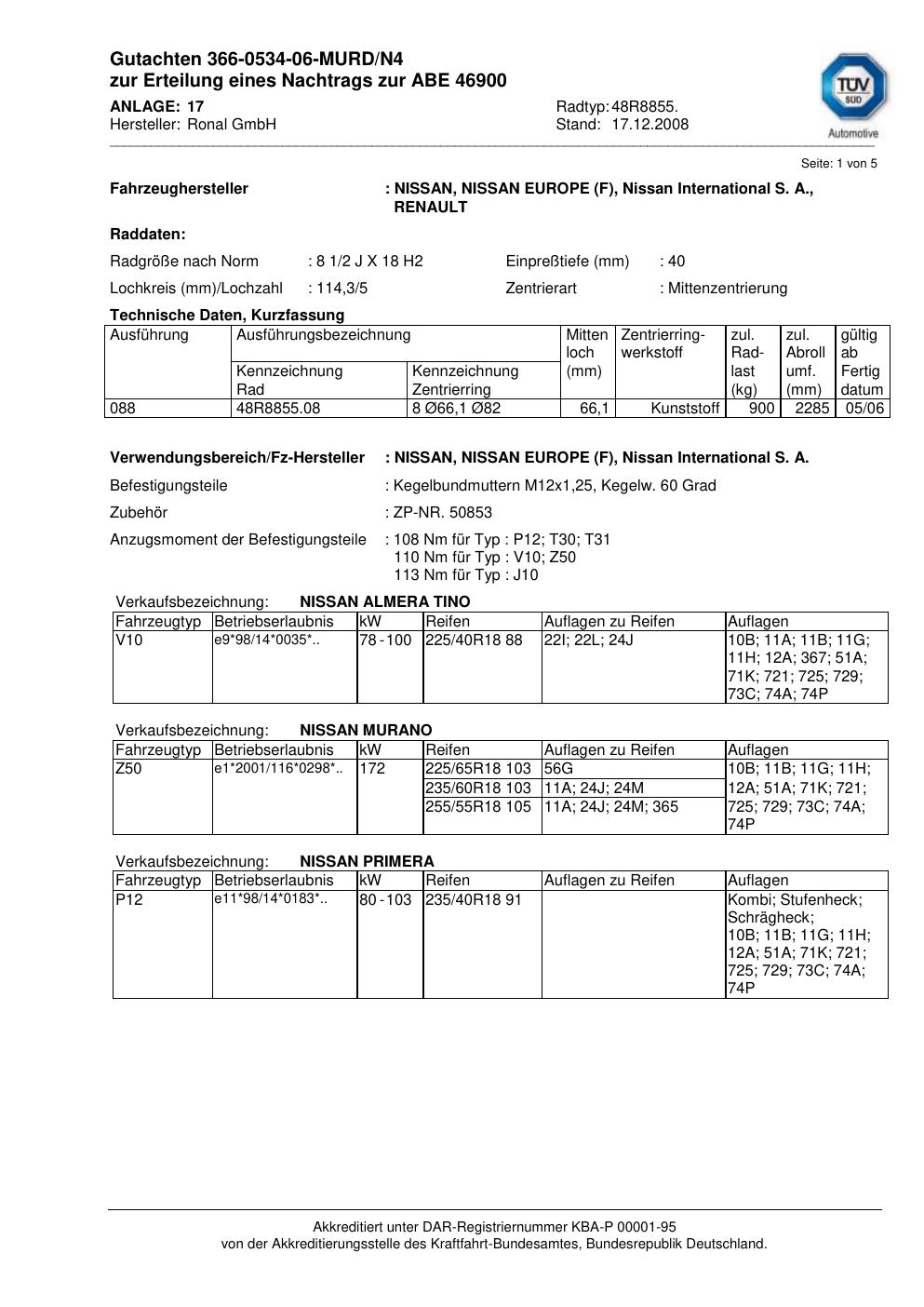 Dieses Gutachten (abe) bezieht sich auf die Alufelge Ronal 48R8855 in der Ausführung 2Jx18 ET 0, Mittenloch 0 mm (KBA 46900). Im PDF findest du typischerweise zulässige Reifengrößen, Auflagen/Anbauhinweise und – je nach Dokument – Hinweise zur Eintragung.