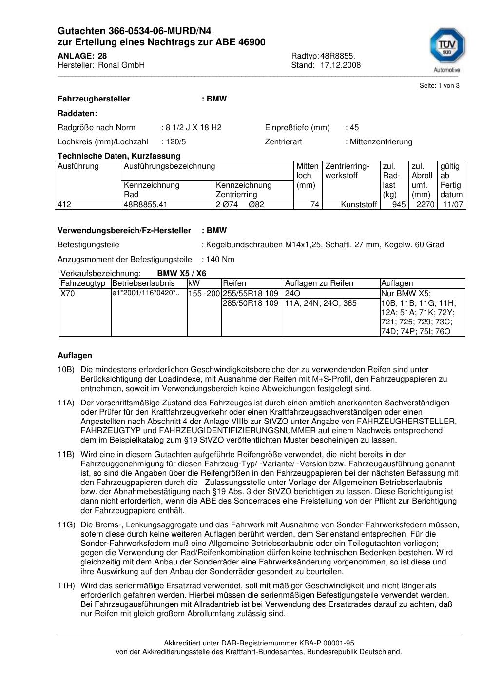 Dieses Gutachten (abe) bezieht sich auf die Alufelge Ronal 48R8855 in der Ausführung 2Jx18 ET 0, Mittenloch 0 mm (KBA 46900). Im PDF findest du typischerweise zulässige Reifengrößen, Auflagen/Anbauhinweise und – je nach Dokument – Hinweise zur Eintragung.