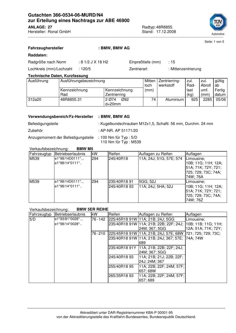Dieses Gutachten (abe) bezieht sich auf die Alufelge Ronal 48R8855 in der Ausführung 2Jx18 ET 0, Mittenloch 0 mm (KBA 46900). Im PDF findest du typischerweise zulässige Reifengrößen, Auflagen/Anbauhinweise und – je nach Dokument – Hinweise zur Eintragung.