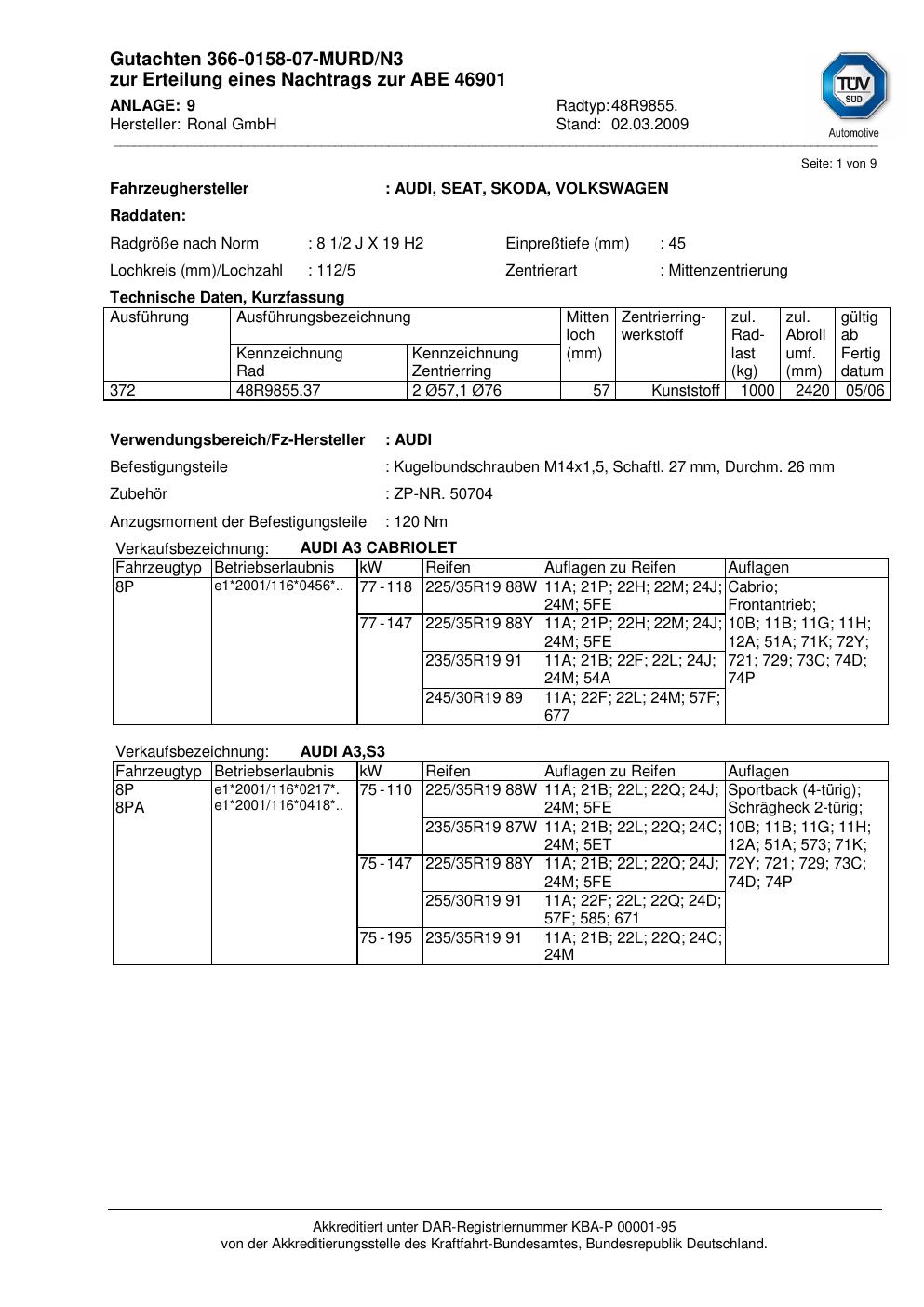 Dieses Gutachten (abe) bezieht sich auf die Alufelge Ronal 48R9855 in der Ausführung 2Jx19 ET 0, Mittenloch 0 mm (KBA 46901). Im PDF findest du typischerweise zulässige Reifengrößen, Auflagen/Anbauhinweise und – je nach Dokument – Hinweise zur Eintragung.