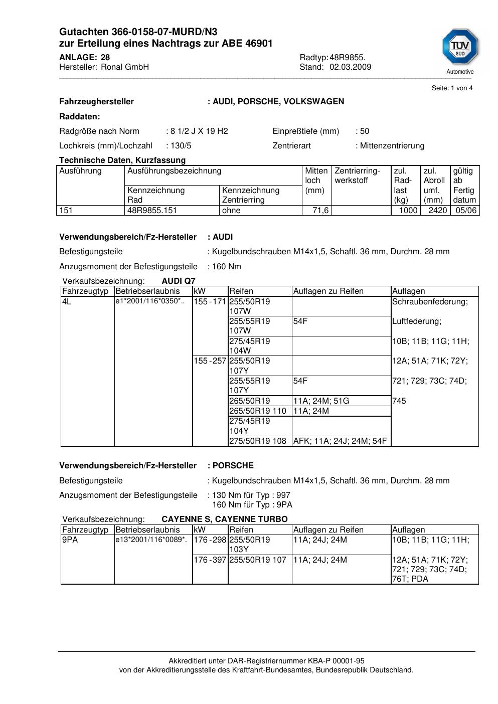 Dieses Gutachten (abe) bezieht sich auf die Alufelge Ronal 48R9855 in der Ausführung 2Jx19 ET 0, Mittenloch 0 mm (KBA 46901). Im PDF findest du typischerweise zulässige Reifengrößen, Auflagen/Anbauhinweise und – je nach Dokument – Hinweise zur Eintragung.