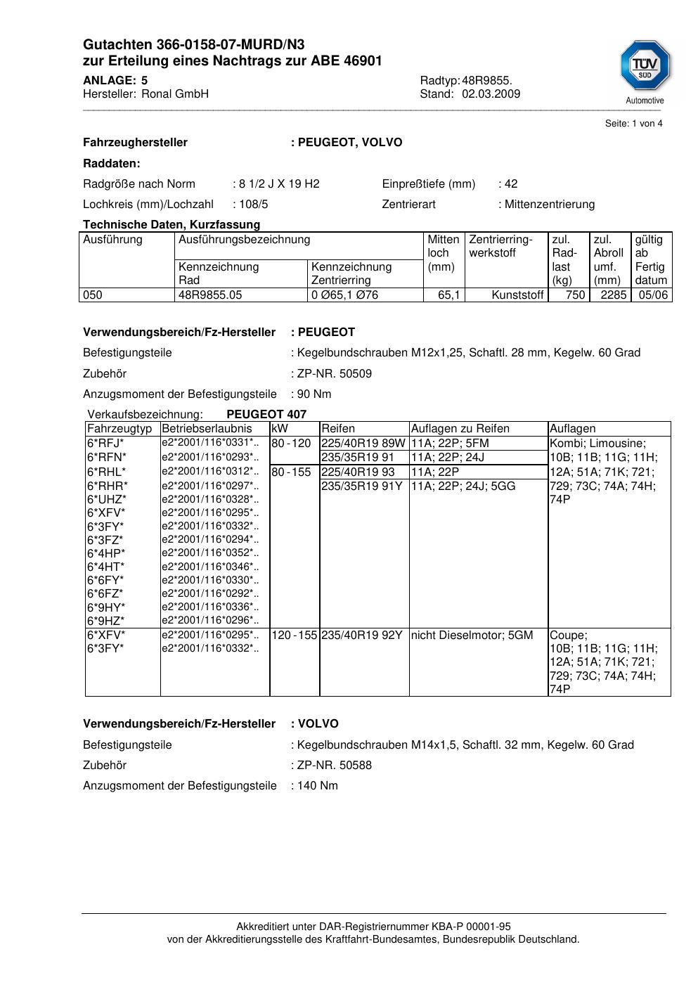 Dieses Gutachten (abe) bezieht sich auf die Alufelge Ronal 48R9855 in der Ausführung 2Jx19 ET 0, Mittenloch 0 mm (KBA 46901). Im PDF findest du typischerweise zulässige Reifengrößen, Auflagen/Anbauhinweise und – je nach Dokument – Hinweise zur Eintragung.