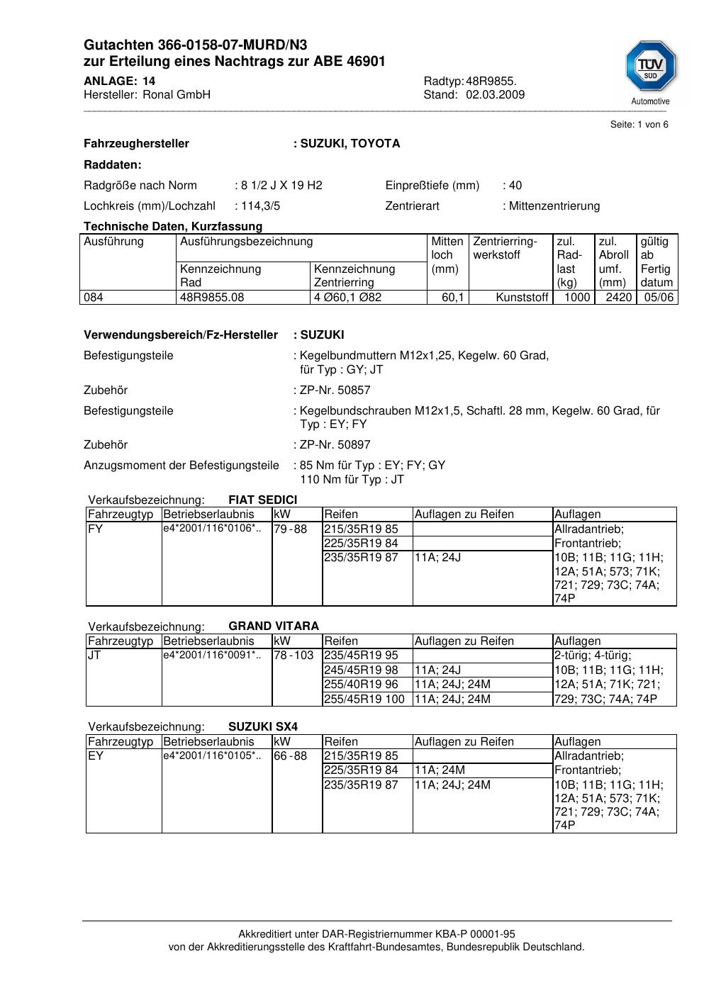 Dieses Gutachten (abe) bezieht sich auf die Alufelge Ronal 48R9855 in der Ausführung 2Jx19 ET 0, Mittenloch 0 mm (KBA 46901). Im PDF findest du typischerweise zulässige Reifengrößen, Auflagen/Anbauhinweise und – je nach Dokument – Hinweise zur Eintragung.