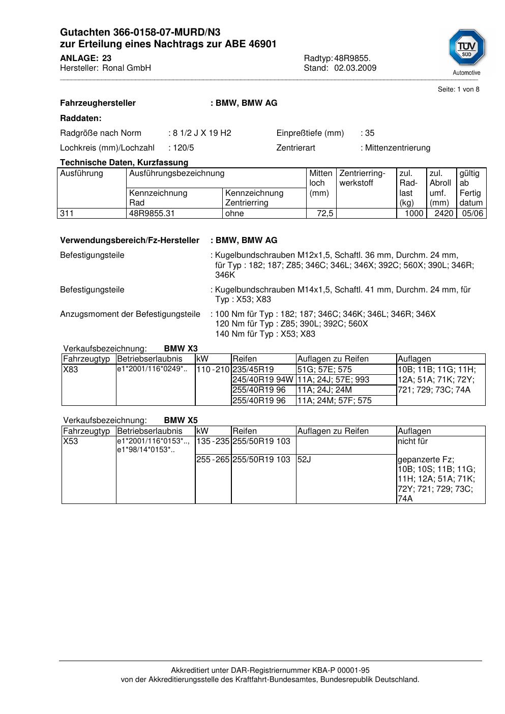 Dieses Gutachten (abe) bezieht sich auf die Alufelge Ronal 48R9855 in der Ausführung 2Jx19 ET 0, Mittenloch 0 mm (KBA 46901). Im PDF findest du typischerweise zulässige Reifengrößen, Auflagen/Anbauhinweise und – je nach Dokument – Hinweise zur Eintragung.