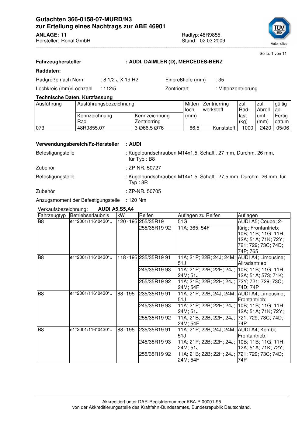 Dieses Gutachten (abe) bezieht sich auf die Alufelge Ronal 48R9855 in der Ausführung 2Jx19 ET 0, Mittenloch 0 mm (KBA 46901). Im PDF findest du typischerweise zulässige Reifengrößen, Auflagen/Anbauhinweise und – je nach Dokument – Hinweise zur Eintragung.