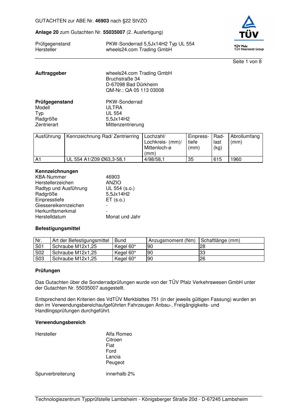 Dieses Gutachten (abe) bezieht sich auf die Alufelge Anzio UL 554 in der Ausführung 5.5Jx14 ET 0, Mittenloch 0 mm (KBA 46903). Im PDF findest du typischerweise zulässige Reifengrößen, Auflagen/Anbauhinweise und – je nach Dokument – Hinweise zur Eintragung.