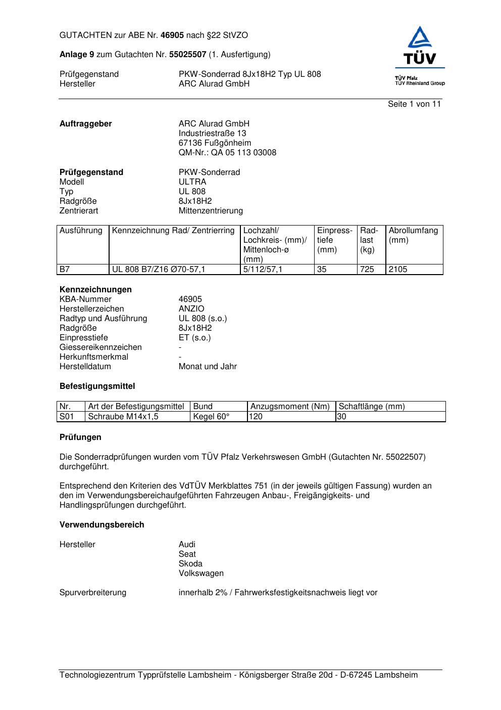 Dieses Gutachten (abe) bezieht sich auf die Alufelge Anzio UL 808 in der Ausführung 8Jx18 ET 0, Mittenloch 0 mm (KBA 46905). Im PDF findest du typischerweise zulässige Reifengrößen, Auflagen/Anbauhinweise und – je nach Dokument – Hinweise zur Eintragung.