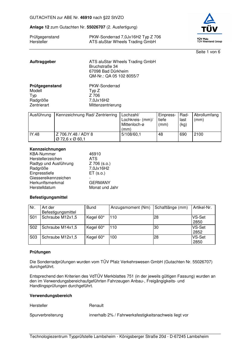 Dieses Gutachten (abe) bezieht sich auf die Alufelge ATS Z 706 in der Ausführung 7Jx16 ET 0, Mittenloch 0 mm (KBA 46910). Im PDF findest du typischerweise zulässige Reifengrößen, Auflagen/Anbauhinweise und – je nach Dokument – Hinweise zur Eintragung.