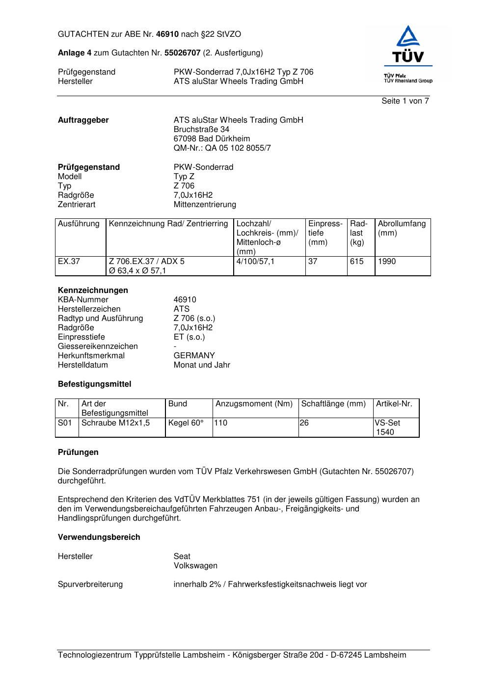 Dieses Gutachten (abe) bezieht sich auf die Alufelge ATS Z 706 in der Ausführung 7Jx16 ET 0, Mittenloch 0 mm (KBA 46910). Im PDF findest du typischerweise zulässige Reifengrößen, Auflagen/Anbauhinweise und – je nach Dokument – Hinweise zur Eintragung.