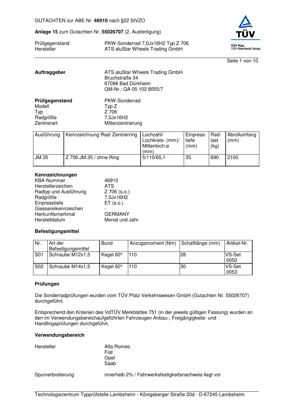 Dieses Gutachten (abe) bezieht sich auf die Alufelge ATS Z 706 in der Ausführung 7Jx16 ET 0, Mittenloch 0 mm (KBA 46910). Im PDF findest du typischerweise zulässige Reifengrößen, Auflagen/Anbauhinweise und – je nach Dokument – Hinweise zur Eintragung.