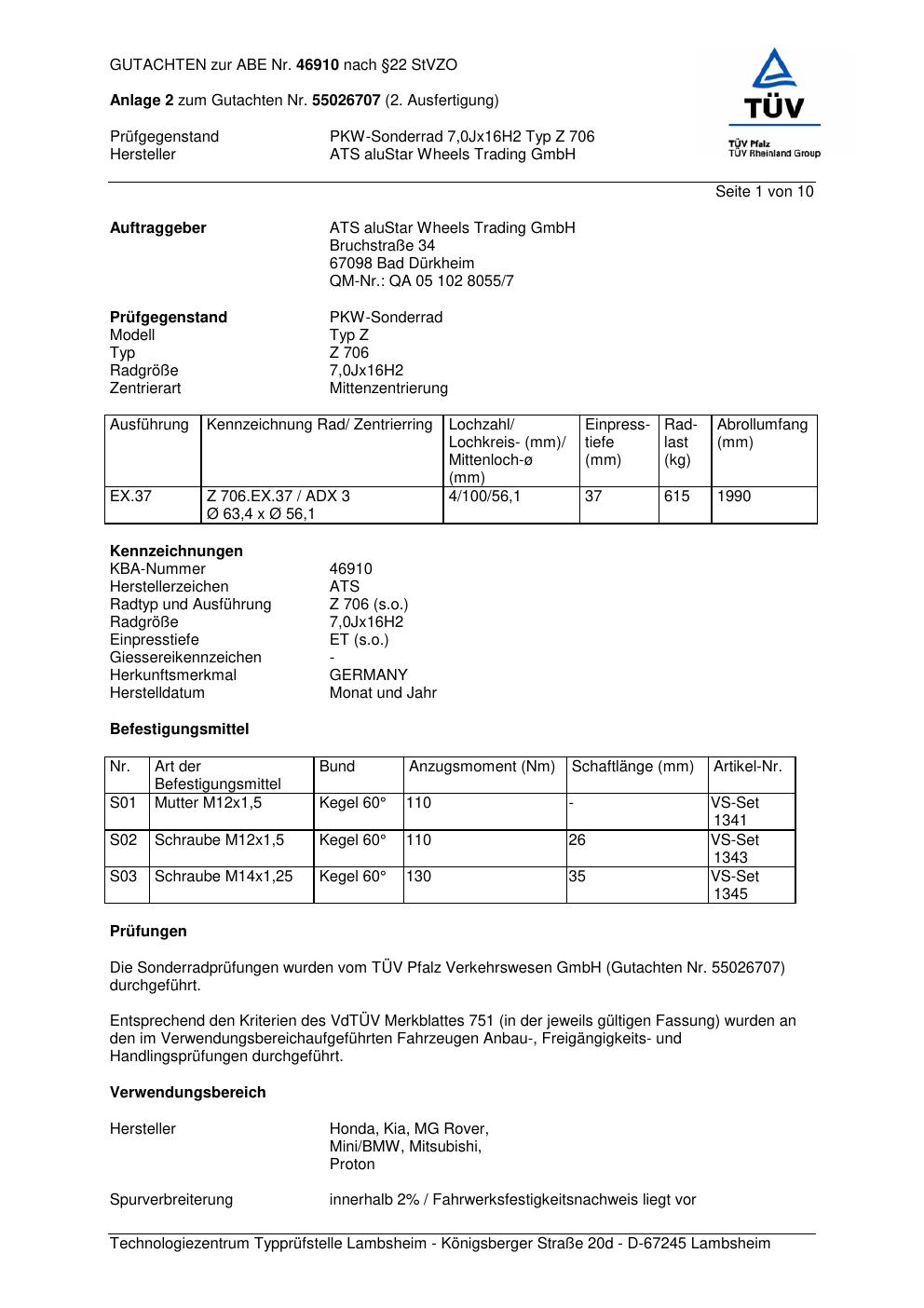 Dieses Gutachten (abe) bezieht sich auf die Alufelge ATS Z 706 in der Ausführung 7Jx16 ET 0, Mittenloch 0 mm (KBA 46910). Im PDF findest du typischerweise zulässige Reifengrößen, Auflagen/Anbauhinweise und – je nach Dokument – Hinweise zur Eintragung.